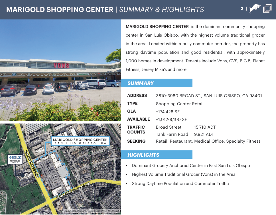 MARIGOLD SHOPPING CENTER is the dominant community shopping center in San Luis Obispo, with the highest volume traditional grocer in the area. Located within a busy commuter corridor, the property has strong daytime population and good residential, ...